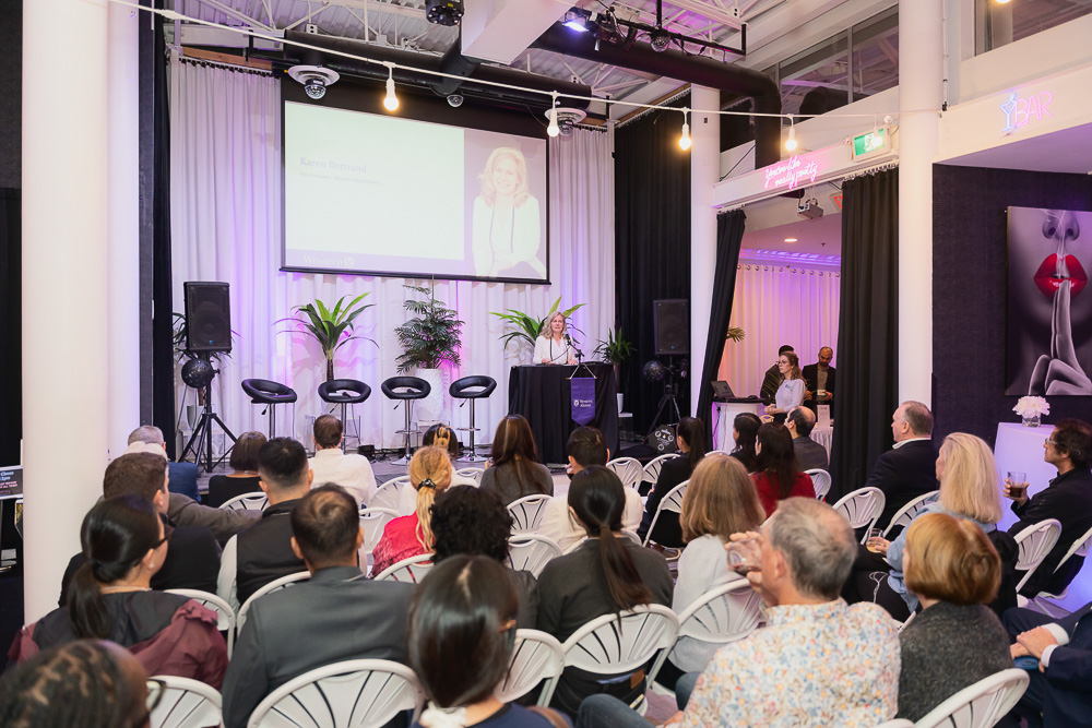 Karen Bertrand Standing At A Podium In Front Of Group Of Alumni