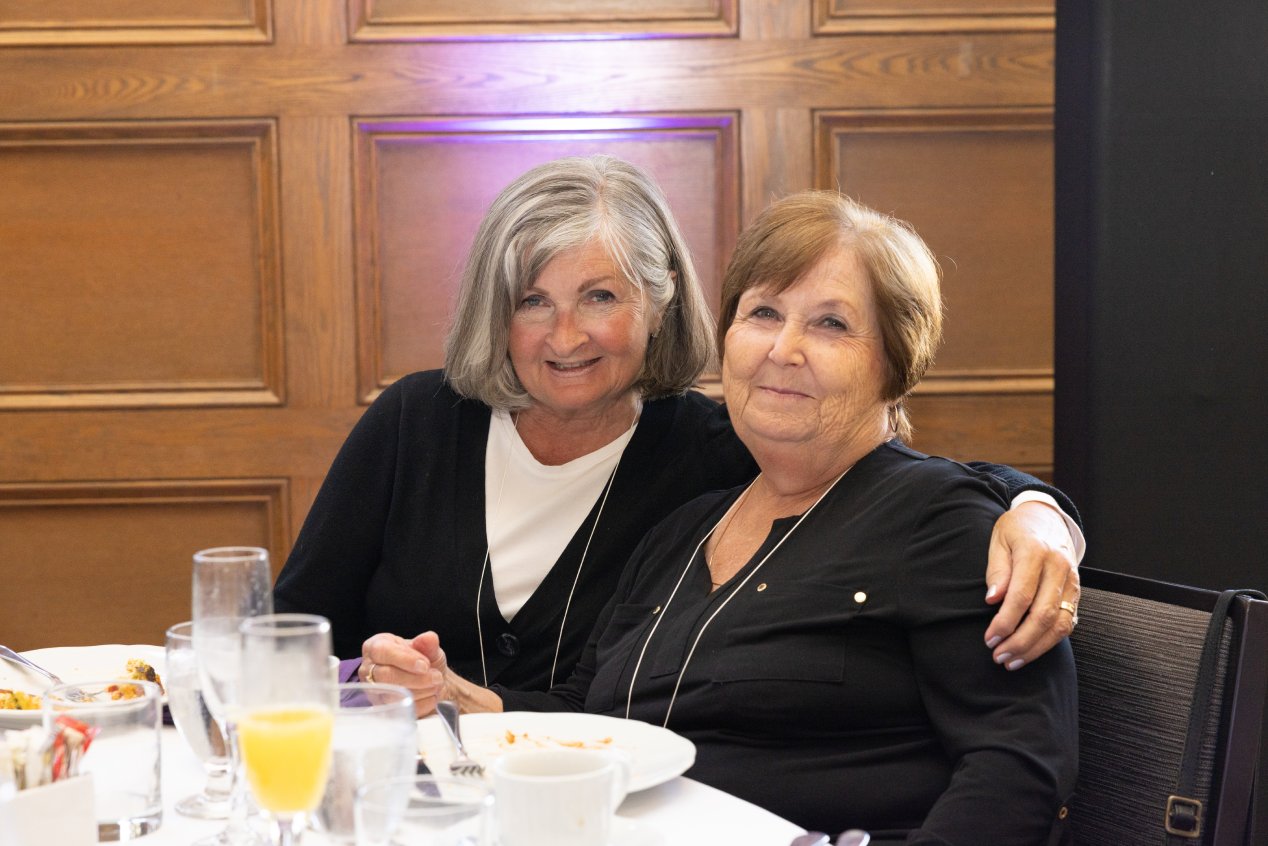 Two Guests Sitting At A Table With Arm Around The Other